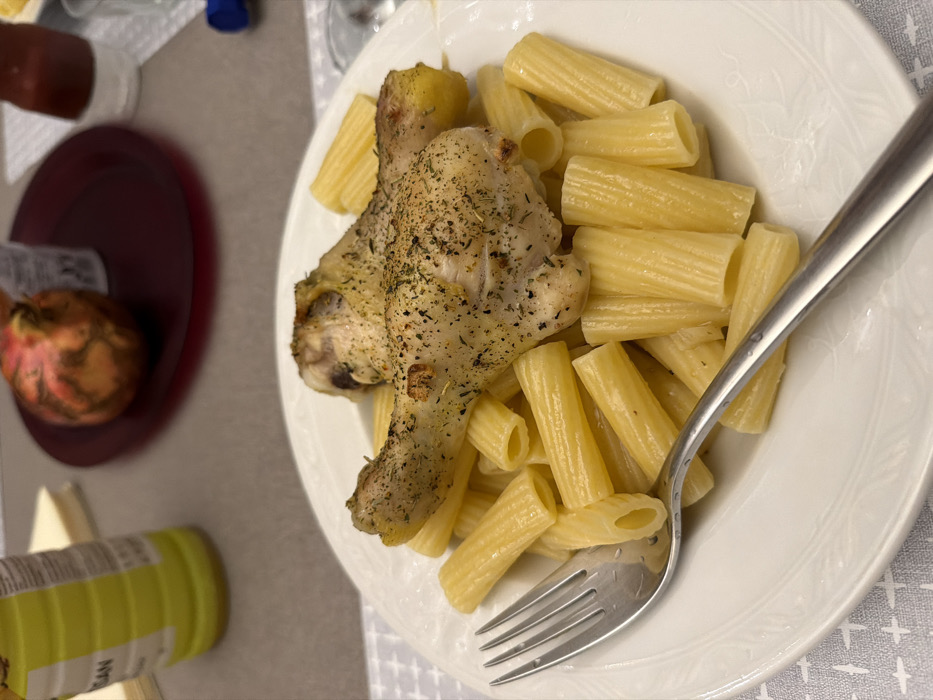 An elevated view captures a prepared meal set on a table in an indoor dining environment, purportedly in Sutomore, Montenegro. A white dinner plate, adorned with a subtle embossed rim pattern, occupies the central foreground. On the plate are two cooked chicken drumsticks, seasoned with dark green and black specks of herbs and spices, resting atop a generous portion of light yellow, ridged rigatoni pasta. A silver four-tine fork lies diagonally on the lower-left portion of the plate, partially submerged in the pasta. The plate is positioned on a light grey placemat featuring a white cross-hatch pattern. The background, largely out of focus, reveals additional table items: to the upper left, a bright yellow plastic bottle and folded light-colored napkins; centrally, a dark red circular plate or tray holding a single, striped fruit (resembling a pomegranate or an unusually colored onion); and to the upper right, a small, clear bottle with red contents (likely ketchup) and a partial view of a clear drinking glass. No individuals are visible.
