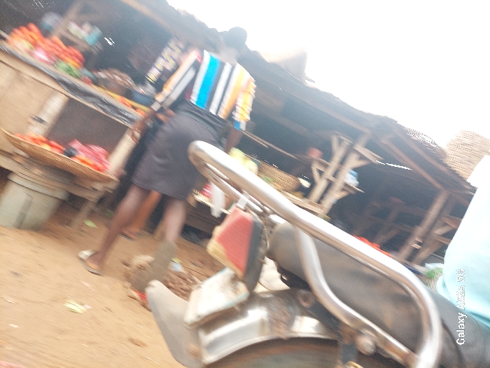 This image captures a tilted, low-angle view of an outdoor scene in Awkuzu, Nigeria. The foreground on the left features a partial view of a silver-colored motorcycle or bicycle, specifically showing its handlebar and a section of its frame, with a red and white element visible on its upper part. The ground in the mid-left consists of reddish-brown dirt, with minor debris scattered. In the midground, a dark-skinned individual is partially visible, wearing dark shorts or trousers and light-colored sandals. They are standing near what appears to be a market stall or display area. This area exhibits various items for sale: brightly colored fabrics or garments with patterns including stripes, red, and orange, are either hanging or folded. Woven baskets or mats are also discernible. Behind these items, a rustic wooden structural framework suggests a temporary or informal shelter. Further in the background, stacked white buckets or containers are visible. The scene is brightly lit, with significant overexposure in the upper right, obscuring some details.