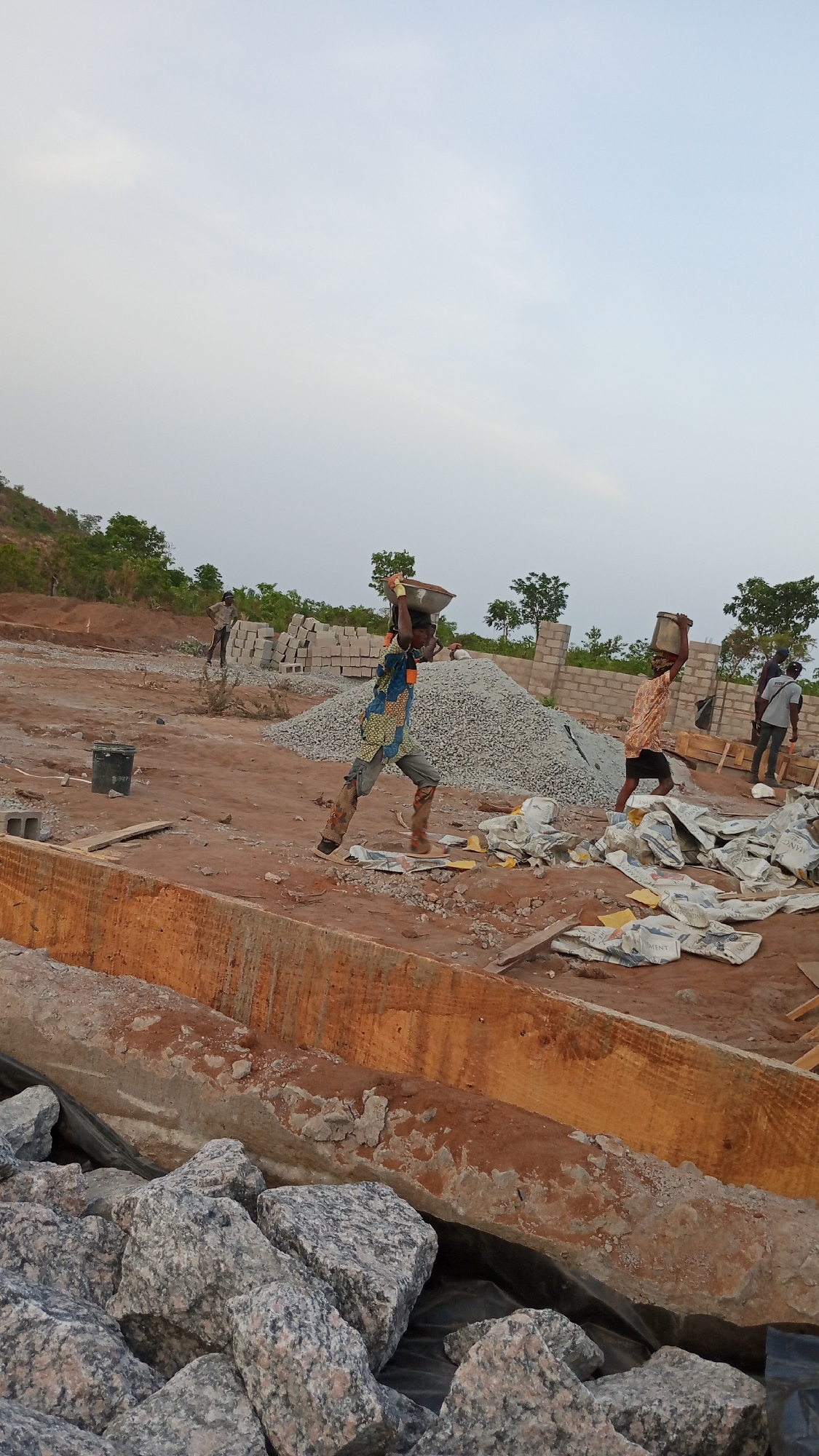 An active construction site in Zango-ndaji, Nigeria, is depicted under an overcast or hazy sky. At least five adult males are present. In the mid-foreground, one male wearing a multi-patterned shirt, grey trousers, and brown boots, with orange gloves, strides rightward while carrying a shallow metal basin of material on his head. To his right, another male in a patterned brown shirt and dark shorts also carries a dark-colored bucket on his head, moving in the same direction. In the background-left, a male stands observing, while further right, two other males are visible near a partially constructed wall of concrete blocks. The ground is composed of reddish-brown disturbed earth. Key construction materials are distributed across the site: a large pile of grey aggregate is central, stacks of grey concrete blocks are to the left and right background, and numerous white "CEMENT" bags are scattered on the ground in the mid-right. In the immediate foreground-left, a black bucket is visible. Running horizontally in the lower-midground is a wooden formwork structure, likely for a concrete foundation or beam, with remnants of concrete. Large, light-colored granite rocks are piled in the lower-left foreground. The background features sparse green vegetation and a low, undulating hill.