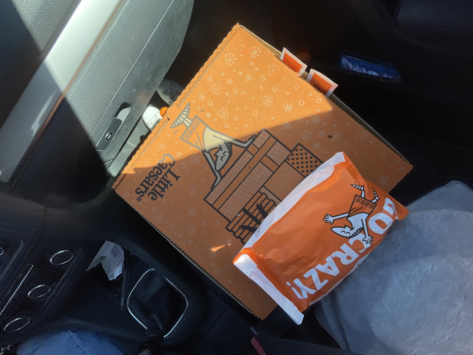 A Little Caesars pizza box and a Crazy Bread bag sit on what appears to be a car floor or seat