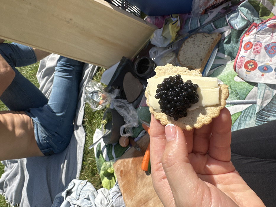 A hand holds a cracker topped with a dollop of butter and a small mound of black caviar. A person is sitting in the background, wearing blue jeans and a bare torso, facing away from the camera. The scene is set on a picnic blanket on a grassy lawn. The picnic blanket is a light gray, with a white, blue, and green patterned blanket underneath. There are other picnic items surrounding the cracker, including a wooden cutting board, a bowl of food, a plastic bag containing food, and a piece of bread. The location is Sefton Park, Liverpool, United Kingdom.