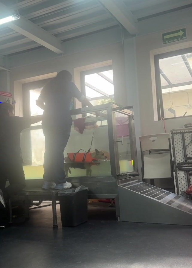 In a bright, well-lit room, a dog is undergoing hydrotherapy in a clear, rectangular tank. The dog, wearing an orange life vest, is walking on what appears to be an underwater treadmill. A person in scrubs stands on a platform next to the tank, overseeing the dog's progress and holding onto a leash attached to the dog’s vest. Another person stands to the left, partially obscured. The tank is positioned between two windows, allowing natural light to filter in. To the right of the tank, there’s a set of steps leading up to it, along with a chair and a metal rolling rack. A sign reading "RUTA DE EVACUACION" (evacuation route) is visible on the wall. The floor is dark and shiny.