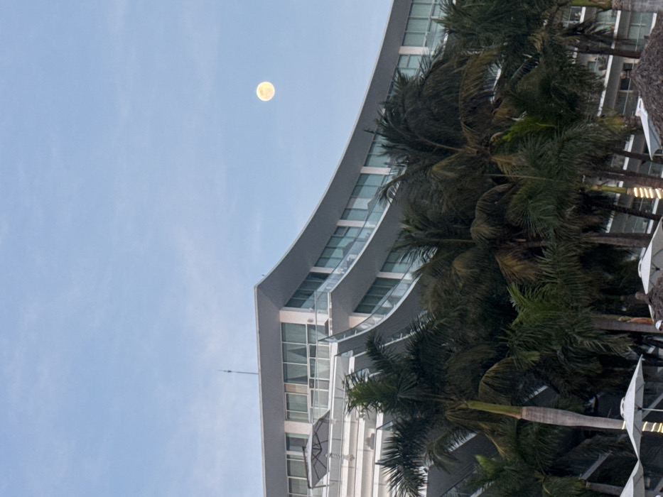 An upward shot reveals a curved building facade with numerous windows next to palm trees. Above, the clear sky hosts a visible moon. The building appears modern, with subtle color variations. The palm trees add a tropical feel, contrasting against the contemporary structure. The moon is slightly blurred, indicating a focus on the architecture and vegetation below.