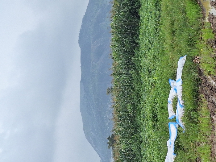 The image displays an agricultural landscape located in the city of Kujama, Nigeria, under an overcast sky. In the foreground, patches of muddy ground with standing water and short green grass are visible. Crumpled pieces of white material with blue edging are scattered on the grass in the lower-left quadrant. The mid-ground features cultivated fields: dense rows of tall green stalks, consistent with maize, dominate the right side, while lower-growing, bushy green vegetation covers the ground to the left. In the background, a large, multi-peaked hill or small mountain, partially vegetated with visible rock formations, rises against a uniformly grey, cloudy sky. No individuals or discernible activities are present.