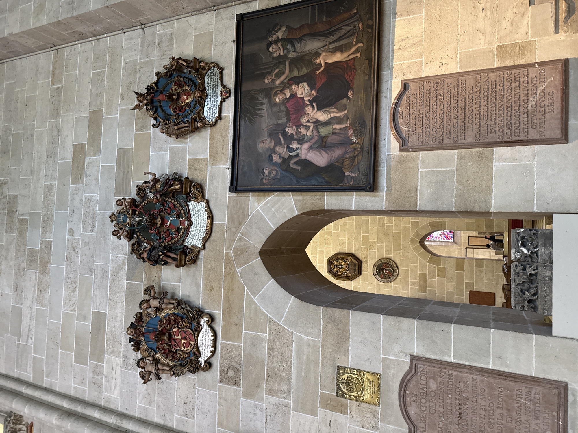 This image depicts the interior of the Ulm Minster (Ulmer Münster) in Ulm, Germany, specifically a section of a stone wall adorned with various historical and religious artifacts. The main wall is constructed from light-colored, rectangular dressed stone blocks. Mounted high on this wall are three elaborate, decorative crests or coats of arms. Each crest features a central shield with heraldic designs, surrounded by intricate carvings of cherubs, human figures, and foliage, with an inscribed plaque at its base. Below the central and right crests, a large, rectangular framed painting hangs. The painting depicts a multi-figure religious scene, with an adult male figure (likely Jesus) centrally positioned, surrounded by several women and children, some of whom are interacting directly with him. To the left of the painting and below the left crest, a tall, pointed Gothic archway pierces the stone wall, leading into another section of the building. Through this archway, a further stone-built interior is visible, featuring an octagonal and a circular decorative plaque on a far wall, and in the distance, another archway with stained glass windows. Two indistinct human figures are partially visible standing or seated in the background beyond the initial archway. To the left of the main archway, a rectangular brass-colored plaque with a relief image (possibly of a knight on horseback) is affixed to the wall. Below this, and partially obscured on the far left, is a large, reddish-brown rectangular stone tablet with extensive engraved Latin text. A similar reddish-brown rectangular stone tablet with engraved Latin text is mounted on the wall to the right of the archway, below the painting. In the immediate foreground, at the base of the archway, carved stone fragments resembling architectural elements or a decorative railing are present on a flat surface. A stone column or pilaster is visible along the far left edge of the image.