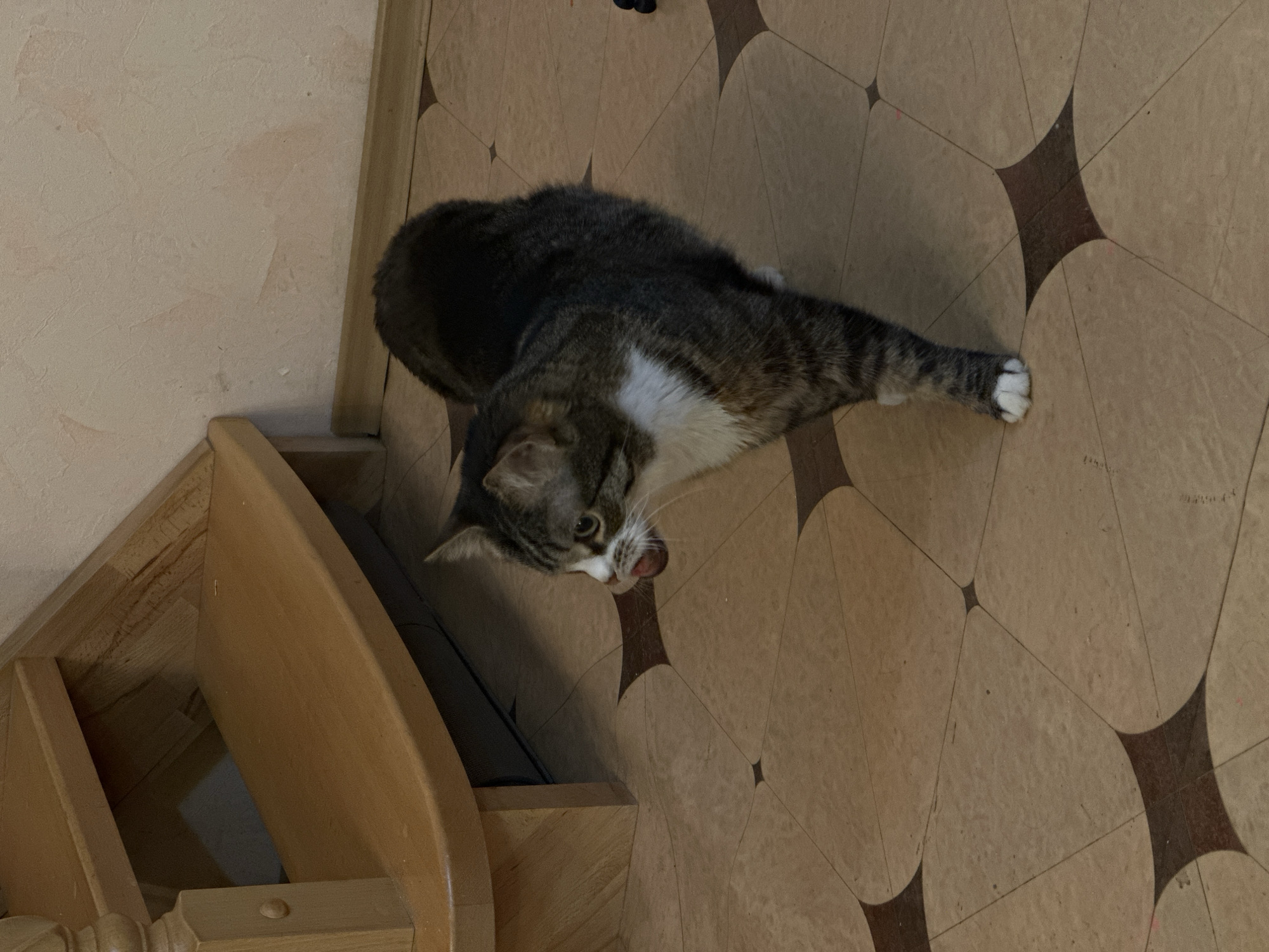 The image depicts an indoor domestic scene. A tabby-patterned cat, with grey and brown stripes, a white chest, and white paws, is captured mid-stride, moving towards the right side of the frame. Its head is turned sharply to the left, mouth open, with a pink tongue slightly protruding. The cat's eyes are focused leftward. The environment consists of a light brown tiled floor with a repeating dark brown geometric pattern. To the left, a light-colored wooden staircase with visible steps and a banister post rises. A textured, light-colored wall with a wooden baseboard is visible in the background on the right. A dark, indeterminate object is partially visible on the floor at the far right. No specific identifying features within the indoor setting indicate a precise location in Odesa, Ukraine.