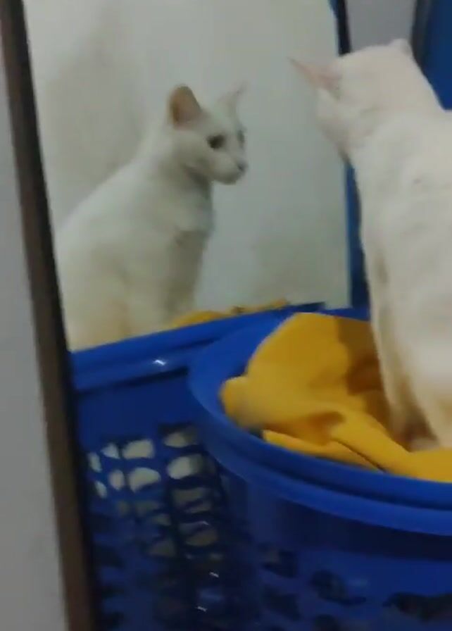 white cat sitting in a blue laundry basket with a yellow cloth inside. The cat is looking at its reflection in a mirror. The background consists of a white wall, a brown wooden trim on the mirror, and a blue coat hanging in the background. The basket is made of plastic and has a mesh design.