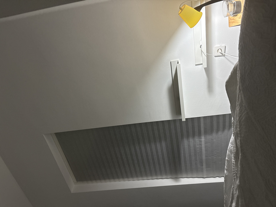 An off-kilter, low-angle shot reveals a partially visible room. A large section of ceiling dominates the left, transitioning to a wall with a striped covering beneath. A yellow lamp shines on the upper right. A white shelf, an electrical outlet, and a mug on a wooden surface are visible on the wall. The edge of a white curtain or sheet hangs down on the right side of the frame.