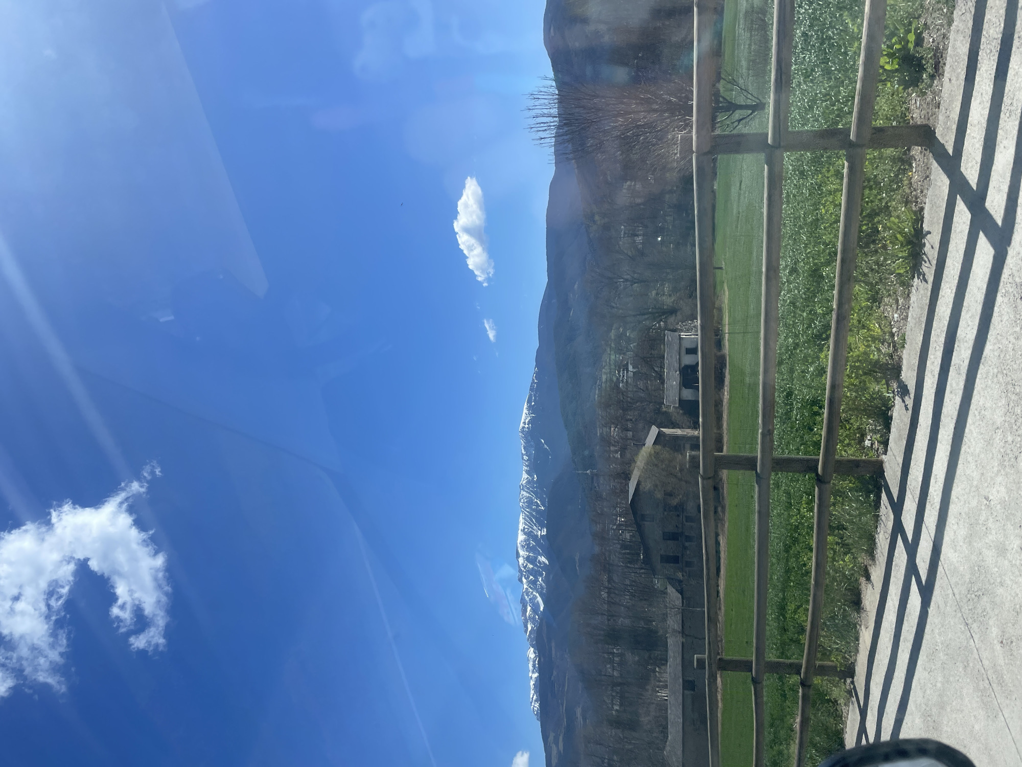 The image presents a landscape with a mountainous backdrop, likely in the vicinity of La Seu d'Urgell, Spain, given the characteristic terrain. The sky is bright blue with scattered cumulus clouds. A mountain range is visible, with some snow still present on the peaks. A wooden fence runs parallel to what appears to be a road or pathway. The fence casts shadows on the ground. Beyond the fence, there is green vegetation, possibly a field or meadow. Buildings are visible in the middle ground near the mountain.