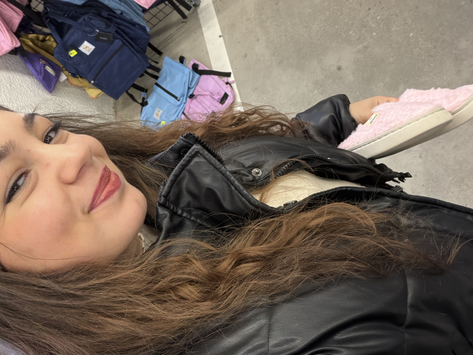 The image depicts a young female subject inside a retail establishment located in Lampertheim, France. The subject, positioned in the left half of the frame, has long, wavy brown hair, dark eyes with visible eyeliner, and reddish lipstick, exhibiting a faint smile. She is dressed in a black faux leather puffer jacket over a light-colored, possibly cream, ribbed top. In her right hand, she holds a pair of light pink, fuzzy slip-on shoes featuring a thick white sole and a partial brand label. The background shows multiple bags or small backpacks in various colors, including dark blue, light blue, purple, and yellow, displayed on black metal grid racks. The flooring is a light gray concrete surface. The photograph is taken from a slightly elevated, downward angle.