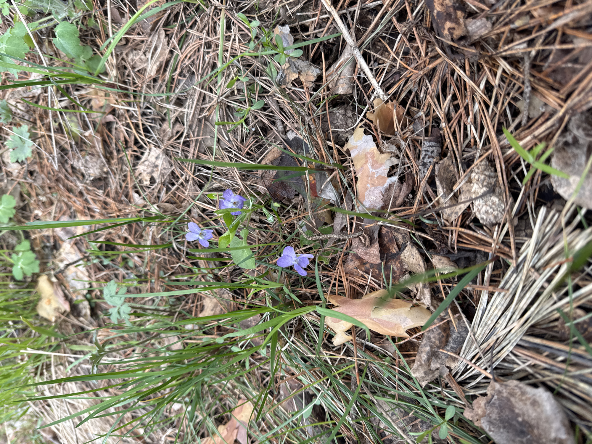 The scene is a close-up, ground-level view of an area covered with natural debris. The ground is covered with dried pine needles and fallen leaves. Sprigs of green grass and small, light purple wildflowers are visible among the debris. There are no people present in the image. The location is not specified, and the description of the city is "Unknown, Unknown".