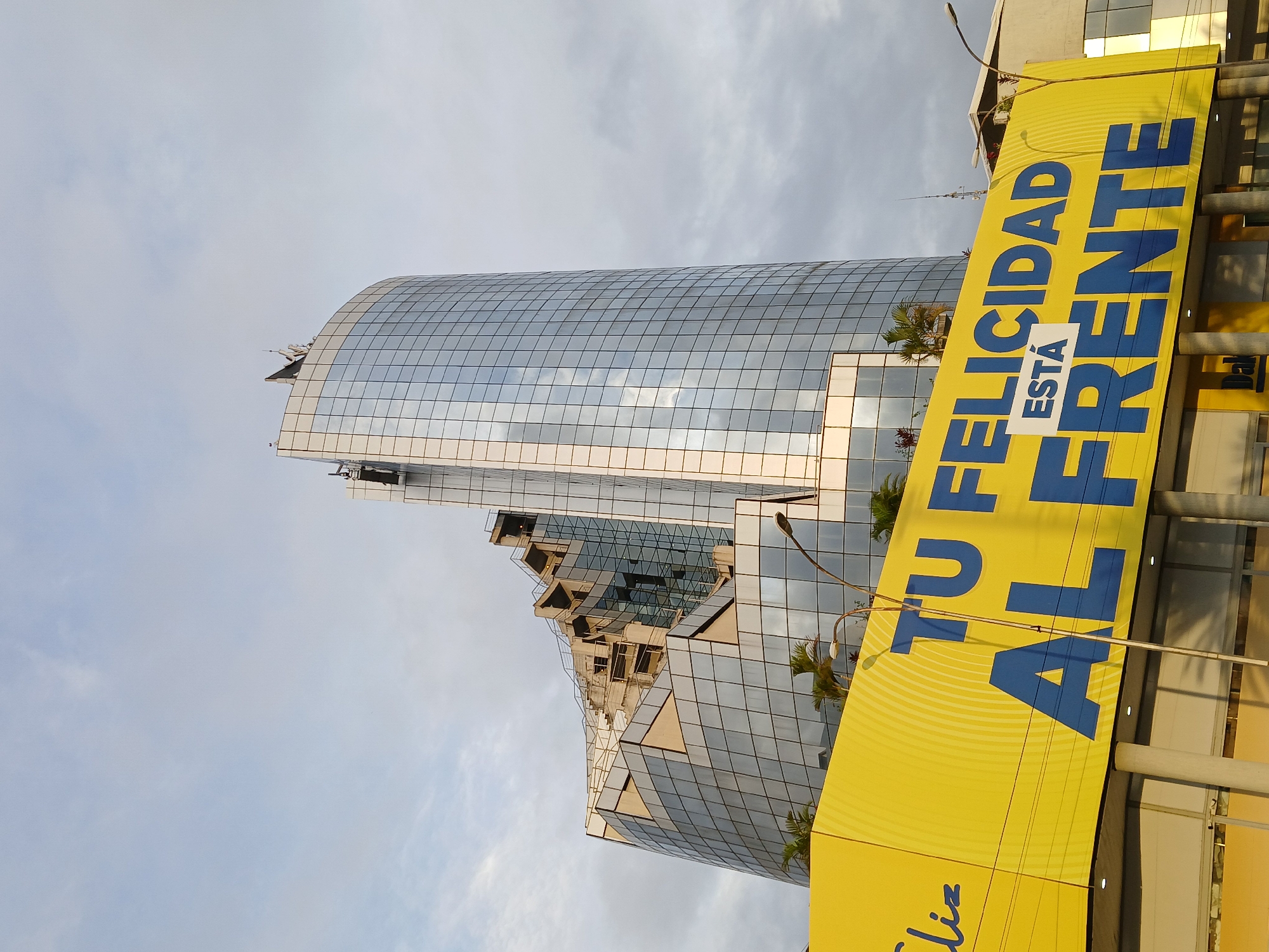 - "A low-angle urban scene in Guayana City, Venezuela, depicts a modern high-rise building and a large yellow banner" by FM-YF5w12, licensed under CC BY 4.0