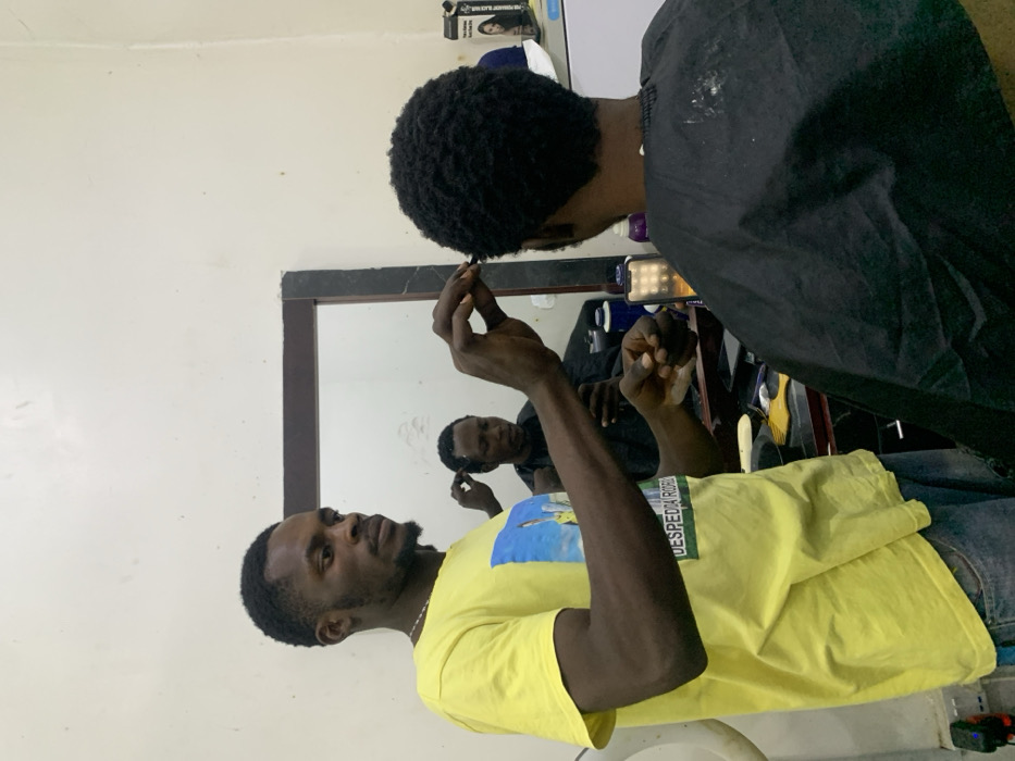 A person in a yellow t-shirt with text and images on the front is visible from the waist up, standing in front of a mirror. The reflection shows the person from the waist up, holding a small strand of another person's dark, curly hair. The other person is seen from the back wearing a dark cape. The scene appears to be in a barber shop.