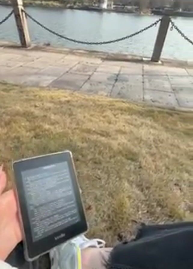 Here's a detailed description of the video: The video shows a person sitting on a patch of dry grass next to a paved walkway and a body of water. The person is reading on a Kindle device, held in their left hand. They are wearing a white sweater, black jeans with rips, and white sneakers with yellow accents. A small tattoo is visible on their ankle. The camera pans up to show the surrounding environment. The paved walkway runs along the water's edge, separated from the water by a chain railing. In the distance, across the water, there is a small structure resembling a lighthouse, as well as a cityscape with buildings and possibly mountains in the background. The sky is blue with some clouds. The overall impression is one of a relaxed outdoor scene, with the person enjoying some reading by the water.