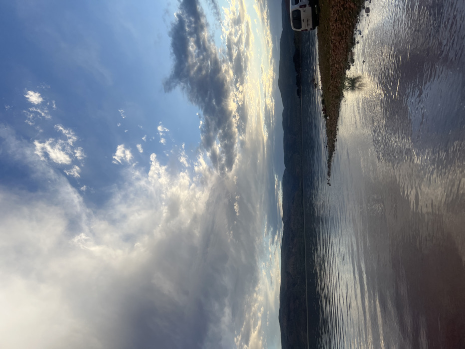 This image depicts a panoramic view of the Bin el Ouidane Dam reservoir in Bin El Ouidane, Morocco, under a partially cloudy sky, likely during dawn or dusk. The foreground features the expansive reservoir, its surface reflecting a blend of blue, grey, and purplish light from the sky, with noticeable ripples. A narrow, rocky shoreline of reddish-brown earth and small green shrubs borders the water on the right side. Parked on this shoreline, towards the far right of the frame, is the rear section of a white utility vehicle or van. In the midground, a continuous range of dark, undulating mountains or hills stretches across the horizon, separating the water from the distant sky. The sky above is a mix of clear blue in the upper right quadrant and a significant mass of stratocumulus and cumulus clouds, predominantly grey and white, with some areas illuminated by diffused light. No people, specific actions, or interactions are visible in the scene.