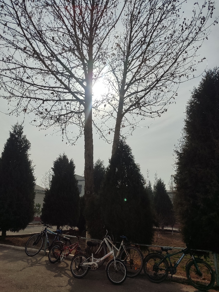 The image depicts an outdoor scene in Rishtan, Uzbekistan, characterized by strong backlighting. The sun is prominently featured as a bright glare in the upper center, partially obscured by two tall, bare, deciduous trees with thin branches, suggesting a late autumn or winter setting. Numerous dark, conical evergreen trees, likely cypress or juniper, form a dense backdrop, arranged in rows and clusters throughout the mid-ground and lower background. In the lower foreground, six bicycles are parked on a paved or dirt surface. From left to right, these include a blue and black mountain bike, a red and black children's bike, a white adult or larger children's bike, two indistinct dark-colored adult bicycles, and a dark green mountain bike with "DIIONGO" visible on its frame. The ground appears dry, with minimal vegetation. A light-colored building is partially visible through the trees in the mid-left background. No individuals are present, and no specific actions or interactions are depicted. The sky is overcast or hazy, diffusing the sunlight.