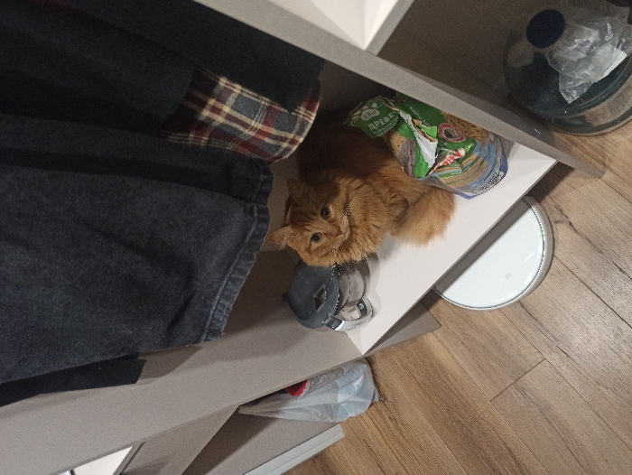 An orange cat sits on a shelf under folded dark clothing. A crushed bag of "ДРЕВЕСНЫЕ" wood pellets rests beside the cat. Underneath the cat, a gray mask sits beside it. Adjacent to the shelf, a partial view of a floor is visible. A white circular object is slightly off the shelf and on the floor, and a glass bowl is on top of the shelf.