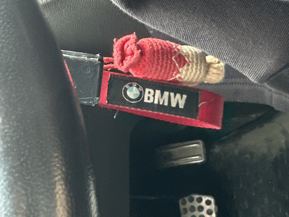 The image displays a close-up, downward-angled view inside a vehicle's driver-side footwell. The specific location in Nekrasovskiy, Russia, cannot be determined from the visual information provided. Visible objects include two metallic pedals on a dark floor surface: a left pedal with a perforated, grid-like pattern, and a right, smooth, rectangular pedal. Above the pedals, a dark, textured surface, likely the underside of a steering column or dashboard, occupies the top portion of the frame. Hanging centrally from an unseen attachment point, possibly an ignition slot or hook, is a keyring assembly. It features a red fabric lanyard-style keychain with a black patch displaying the BMW logo and the word "BMW" in white, oriented vertically. Adjacent to this, and also hanging, is a small, handcrafted ornament or charm. This item is predominantly red at the top, transitioning to a beige or light tan crocheted lower section, with a small white diamond pattern at the intersection of the two colors. A dark grey or black fabric, possibly clothing, is visible along the right edge of the frame, partially overlapping the hanging objects. No people are visible, and no active actions or interactions are depicted.