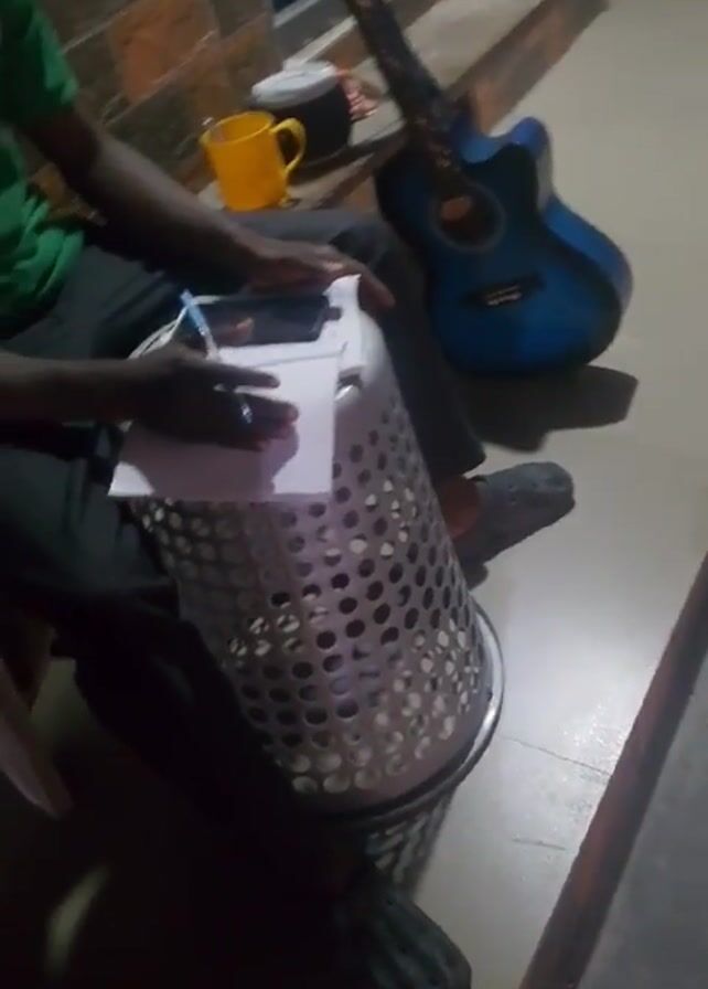 A man is sitting on a chair with a metal laundry basket turned upside down in front of him, using it as a makeshift table. He is wearing a green shirt, black pants, and dark sandals. He's holding a pen and writing on a piece of white paper placed on top of the basket. His phone is also on the paper. To his right is a blue acoustic guitar leaning against a brick wall. A yellow mug and a black container are also near the guitar. The floor appears to be tiled. The lighting is dim.