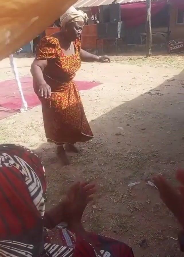 A woman in a brown and orange dress and headscarf is dancing outside on a sandy patch of land. There are buildings in the background, and she is dancing in front of a red rug. People are clapping their hands and watching her dance. She is barefoot. The video is filmed from under a tent, and the fabric of the tent is in the foreground.