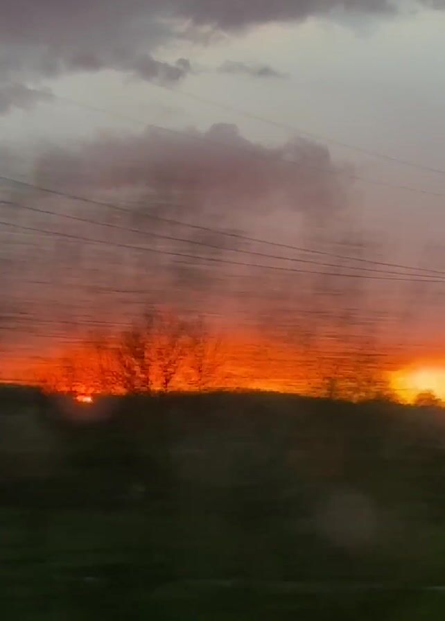 view from a moving vehicle of a vibrant sunset with orange and yellow hues on the horizon. Above the sunset, the sky is filled with grey clouds and power lines stretch across the top of the frame. The landscape consists of a green field in the foreground and a dark line of trees and shrubs in the midground, silhouetted against the bright sunset. A tall metal utility pole appears against the colorful sky. The view is somewhat obscured by the movement of the vehicle.