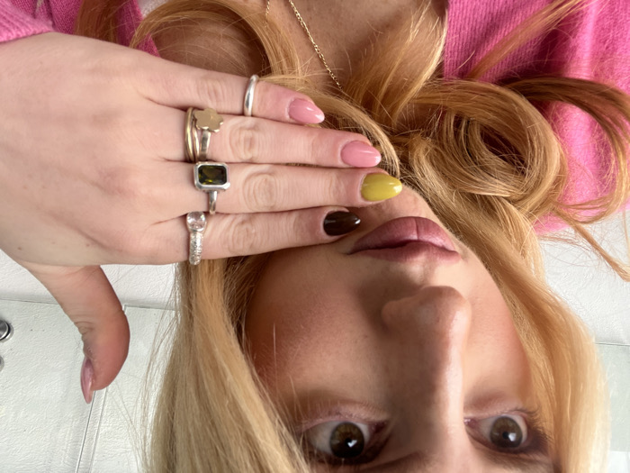 A close-up image depicts a female individual in an indoor setting within Santiago Yancuitlalpan, Mexico. The subject, a woman with light skin, light brown or hazel eyes, and blonde hair, is partially visible from the chest up. She wears a bright pink garment and a thin gold-colored necklace chain. Her right hand is positioned near her chin, with fingers slightly curled and the palm facing the camera. Her fingernails display varied polish colors: the thumb, ring finger, and pinky are light pink; the index finger is dark brown or black; and the middle finger is bright yellow-green. The index finger of her right hand features a silver-colored ring with a rectangular dark green gemstone. The middle finger displays three rings: a silver-colored band with a clear stone, a plain silver-colored band, and a gold-colored band with a small clover design. A simple silver-colored band is on her ring finger. The subject looks directly towards the camera. The background is a blurred light-colored wall with partial reflections, and a silver-colored fixture is visible on the right.