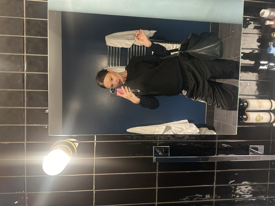 The image displays a mirror selfie of a female individual in a modern hotel bathroom, identified as consistent with The Lowry Hotel in Manchester, United Kingdom. The subject, with dark hair pulled back, red lipstick, and dark nail polish, wears a dark long-sleeved top, dark, loose-fitting trousers, and carries a dark shoulder bag. She holds a light pink smartphone with a patterned back and attached charm to capture the photograph. The bathroom features dark, rectangular tiled walls on the left, reflecting a bright, cylindrical wall-mounted light fixture and a chrome vertical bar. The mirror reflects a deep blue wall behind the subject, a chrome heated towel rail draped with white towels, and a light blue vertical panel on the far right. On the dark countertop beneath the mirror, two pump bottles, distinctly labeled "KRANKY" and "BRAHLE," are visible alongside other assorted toiletries.