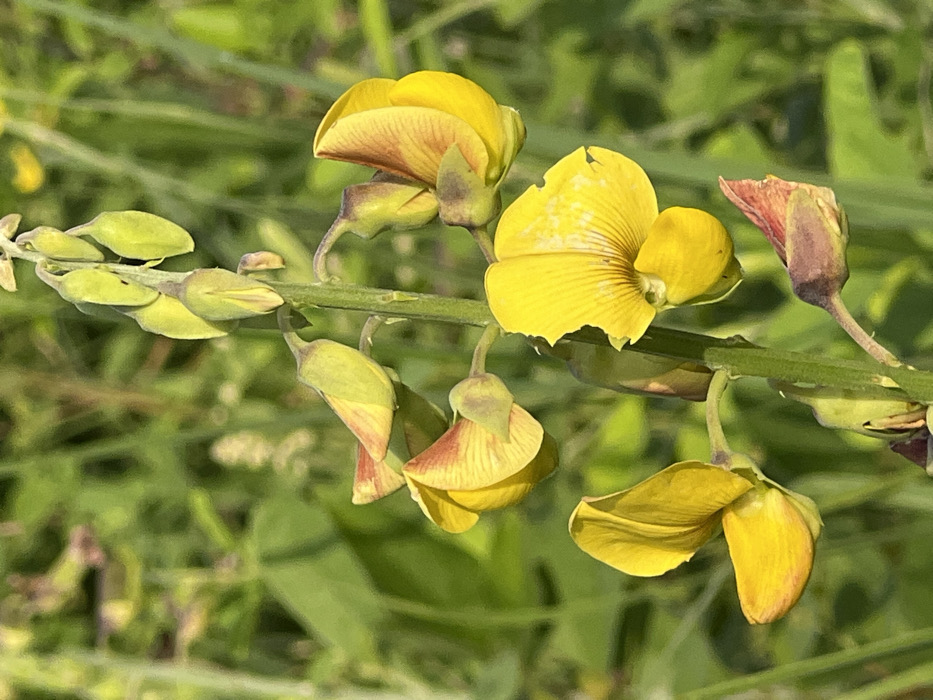 The image displays a close-up, vertical perspective of a plant's inflorescence, situated in Logba Adzakoe, Ghana. The central element is a green herbaceous stem bearing multiple yellow flowers and various buds. Several flowers are fully open, appearing bright yellow with prominent venation and a pea-like structure. Minor imperfections, including small tears and white marks, are visible on some yellow petals. Portions of the open flowers and several buds exhibit a reddish-brown tint. Numerous elongated buds, primarily light green to yellowish-green, are distributed along the stem. The background is composed of out-of-focus green foliage, indicating an outdoor, natural environment under daylight conditions. No human presence or explicit actions are observed.