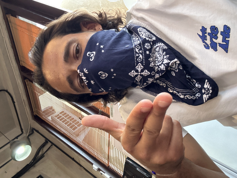 The image captures a male individual indoors in Pecatu, Indonesia, shown from a close-up perspective. The subject, possessing medium-length dark hair, is wearing a white t-shirt featuring a blue "Arte Arte Arte" graphic. A dark blue bandana with white paisley patterns covers his nose and mouth, leaving his eyes exposed. A small hoop earring is visible in his left ear. He extends his left hand towards the camera, forming a gesture with an extended index finger and thumb, resembling a finger gun, while his other fingers are curled. A thin bracelet with a blue bead is visible on his left wrist. The background reveals an interior space with a concrete ceiling, exposed electrical wiring, and a metallic light fixture with an illuminated bulb. Windows or openings covered by light-colored horizontal blinds are visible behind the subject. A dark, rectangular object is partially discernible on a surface behind the subject's left hand.