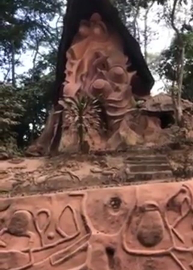 large, light brown, clay-like structure that appears to be a hut or building in a forest or park-like setting. The building is elevated and accessible by a short set of stairs. It has a sharply angled, triangular roof. The front of the building is adorned with a complex, sculpted design featuring rounded shapes and layered textures. A small palm tree grows near the structure. The base of the structure and the retaining wall are decorated with various carved shapes and figures, giving it a distinctly artistic or cultural appearance. The surrounding environment consists of trees and foliage, indicating a natural setting. The lighting suggests an overcast or partially shaded day.