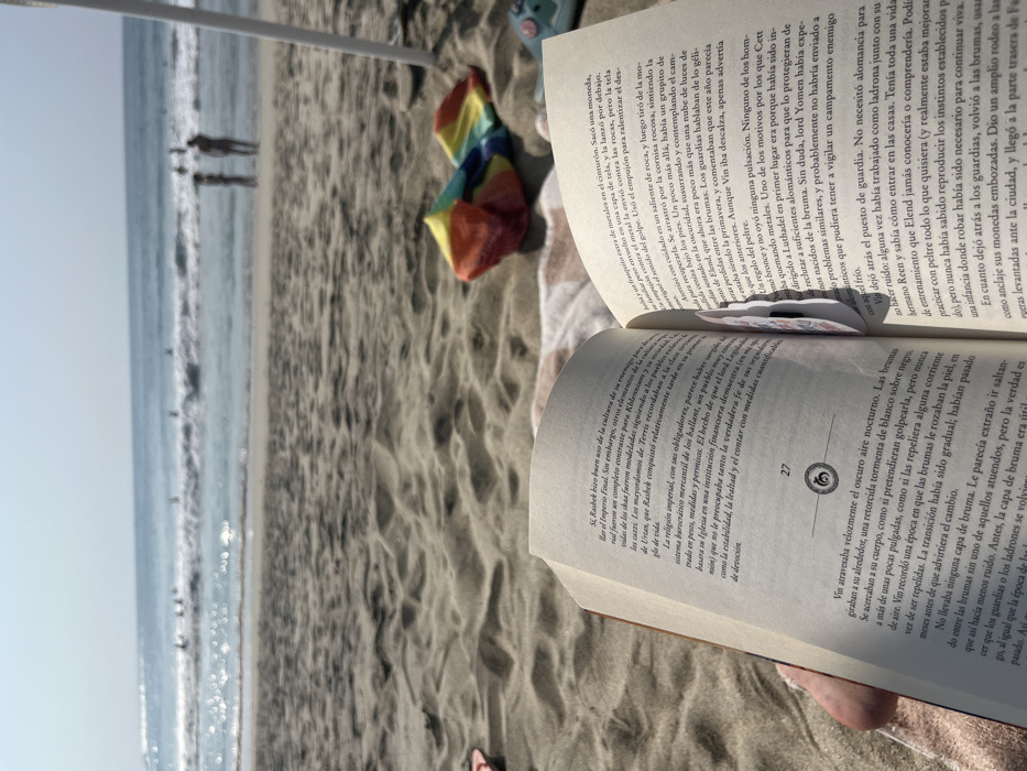 A person is reading a book on a sandy beach. The book is open, with text visible in Spanish. The right page mentions "lord Yomen" and "campamento enemigo". The left page mentions "Imperio Final" and "medidas cuantitativas". A small colored object lies near the book. In the background, a blurred image shows a beach with the ocean and a couple of people walking near the water.