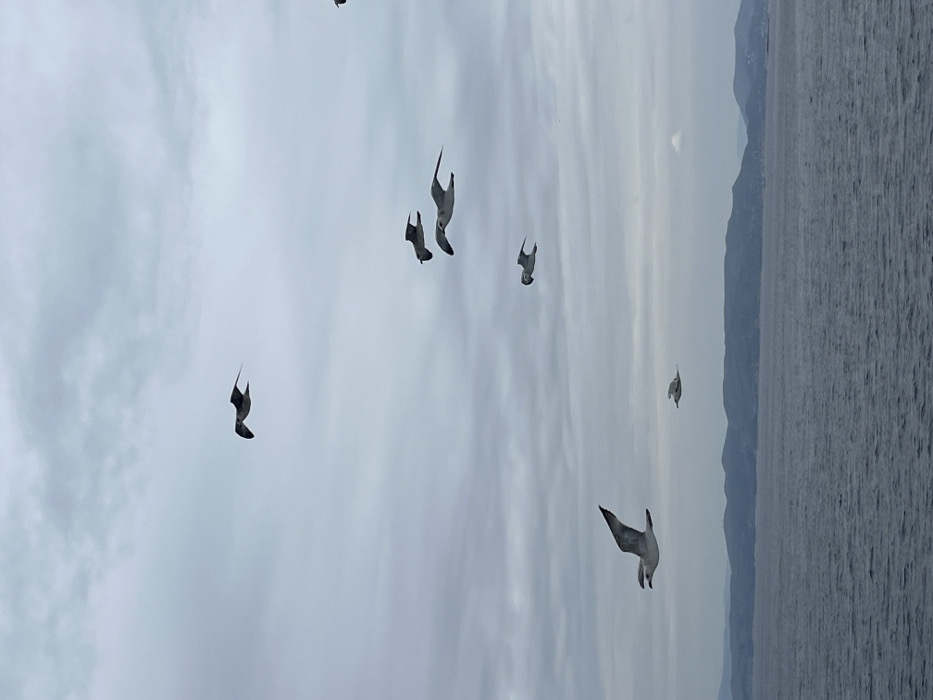 The scene is situated in the city of Kypseli, Greece. The image presents an expansive view of open water and an overcast sky. The sky, occupying the upper two-thirds of the frame, is a uniform light gray, characterized by soft, textured cloud formations. The lower third of the image shows dark blue-gray water, exhibiting ripples across its surface. A distant horizon line reveals undulating landmasses, appearing as dark, misty hills or mountains, situated between the water and the sky. Six gulls are observed in various stages of flight across the sky. One prominent gull is in the lower-left foreground, flying left with wings extended. A smaller, more distant gull is located in the lower-middle section, also flying left. In the mid-right area, a cluster of three gulls is flying leftward. A solitary gull is positioned in the upper-middle of the frame, also moving left. No human subjects or man-made objects are discernible within the immediate visual field.