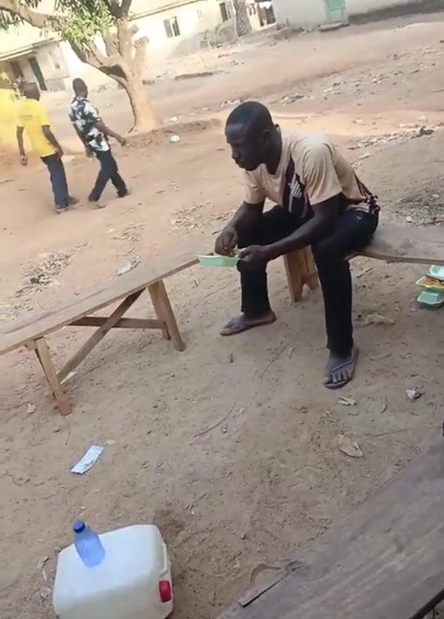 man sitting on a wooden bench outdoors and eating from a green plate with a spoon. He is wearing a short-sleeved shirt, black pants, and sandals. Next to him on the bench are two more plates with food. In the foreground, there is another wooden bench and a white plastic container with a blue water bottle on top. In the background, two men are walking away. The ground is dirt, and there are a few buildings and trees visible. Music is playing.