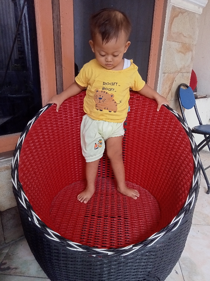 A young child stands in a large, round, woven chair. The chair is black and red with white trim. The child wears a yellow t-shirt with a tiger design and light-colored shorts. The child is looking down with their hands resting on the chair's rim. In the background, there's a doorframe, a wall, and a blue chair. The scene appears to be outdoors on a tiled surface.