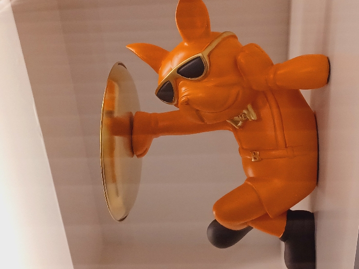 An orange bulldog figurine, sporting sunglasses and a bow tie, is mounted to a wall. The bulldog is depicted in a climbing or leaning posture, with one hand pressing on a circular, golden plate. The figure is wearing a suit-like outfit with a belt. The paws of the bulldog appear to be black. The wall is light, suggesting an interior setting.