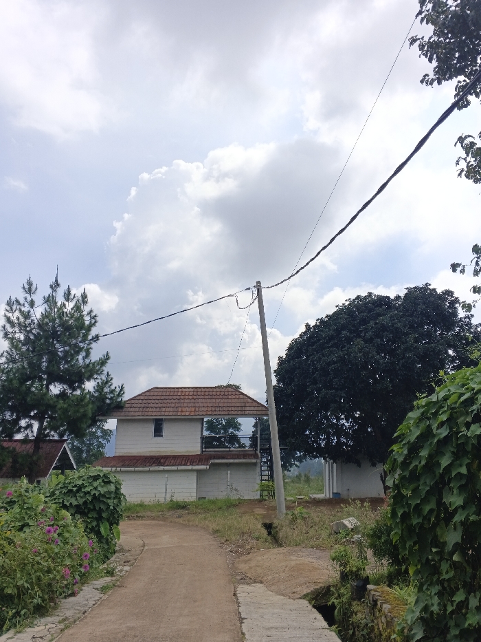 The image depicts a residential scene in Maw Hit, Myanmar, under a partly cloudy sky. A narrow dirt path, partially paved with concrete segments, extends from the foreground and curves left. On the left side of the path, dense green foliage is visible, interspersed with clusters of small pink flowers. On the right, a concrete culvert spans a narrow drainage ditch. A light-colored utility pole, supporting multiple overhead electrical or communication wires, stands slightly right of the path's center. One prominent, thick, twisted cable extends from the upper right across the frame. To the left of the utility pole, a two-story building with white walls and a reddish-brown tiled roof is situated. This building features a single dark, rectangular window on its upper floor and a lower-level structure with reflective paneling. A tall, dark green coniferous tree is positioned to the left of this building, with a portion of another structure, also with a reddish-brown tiled roof, visible behind the foliage on the far left. To the right of the utility pole, a large, densely foliated, dark green deciduous tree dominates the mid-ground. The background reveals indistinct distant terrain or hills beneath the predominantly cloudy sky. No individuals or discernible actions are present within the scene.