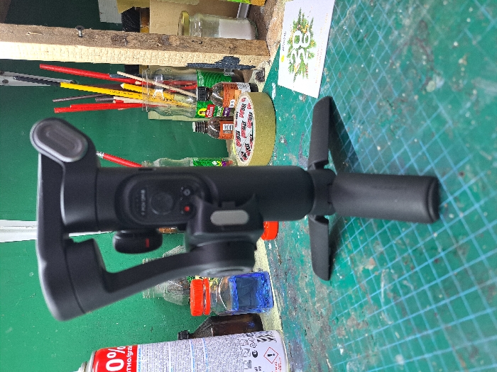 - "A matte black electronic camera gimbal stands upright on a worn teal-green cutting mat with a white grid pattern" by FM-kdrvj1, licensed under CC BY 4.0