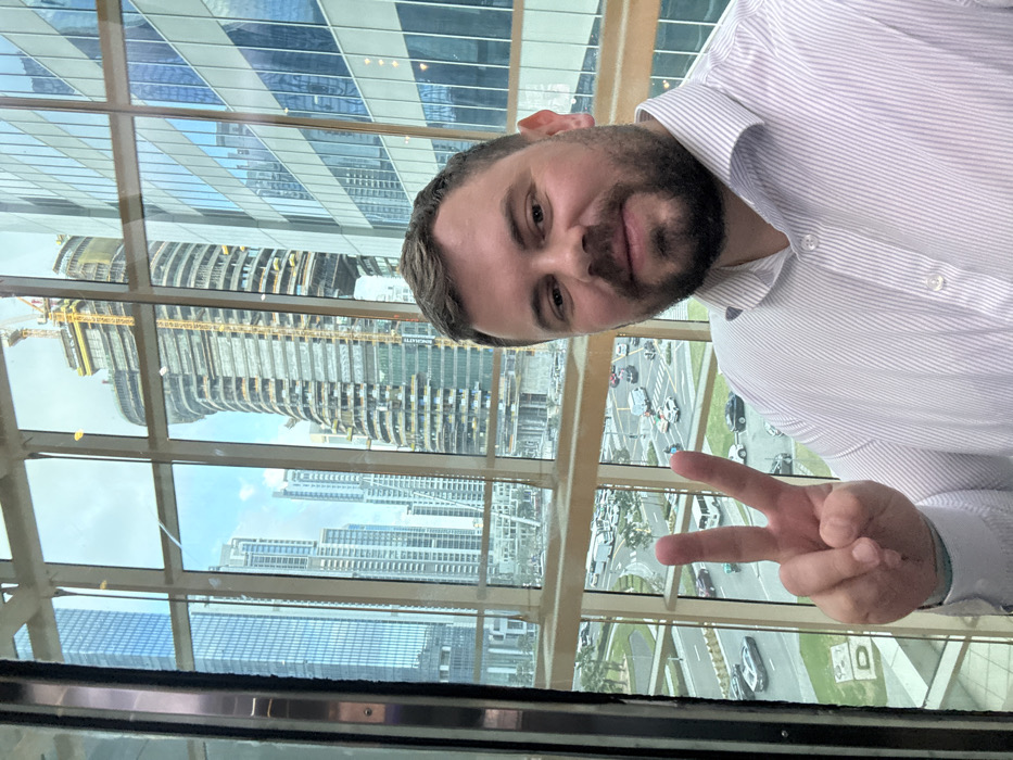 A male individual is featured prominently in the foreground, positioned indoors, taking a selfie or being photographed through a large window. He has short brown hair and a beard, is smiling, and is gesturing a "V" (peace) sign with his right hand. He wears a light-colored, vertically striped button-up shirt with the top button unfastened. The background, visible through the window, depicts an urban landscape in Business Bay, United Arab Emirates, under a partly cloudy sky. The view includes a multi-lane road at ground level with multiple vehicles, including cars, vans, and a bus, indicating active traffic. Beyond the road, numerous modern skyscrapers dominate the horizon. A distinctive, curving high-rise building, currently under construction with visible scaffolding and yellow tower cranes, is prominent in the mid-ground. Adjacent to it, a fully constructed glass-clad skyscraper reflects the sky. Further left, additional completed high-rise buildings are visible. The window's metal framing creates a grid pattern across the cityscape.