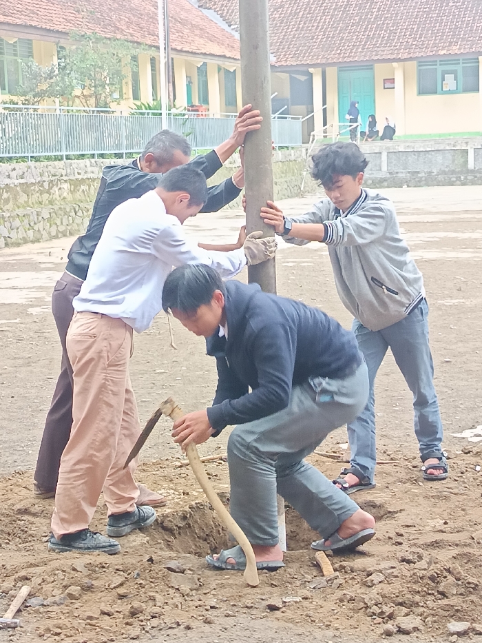 Four people are erecting a pole. Three individuals are holding the pole upright, while one person uses a pickaxe to dig around its base. The workers are dressed casually, wearing a mix of pants, shirts, and sandals. The scene is set outdoors on a dirt ground with buildings visible in the background. There's a stone wall and some greenery on the left side.