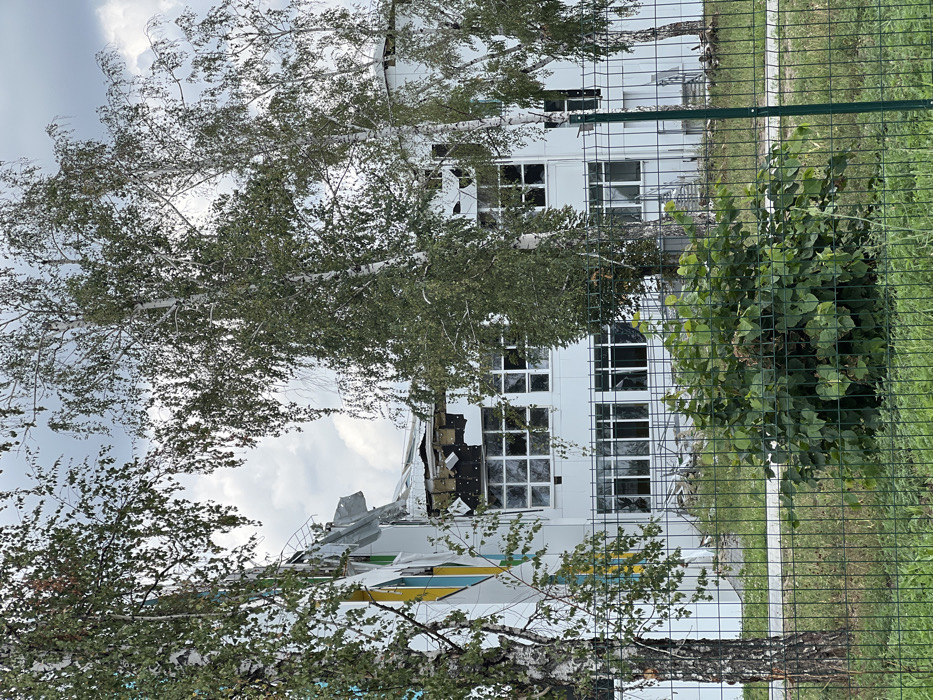 The image depicts the exterior of a two-story building in Staryi Saltiv, Ukraine, exhibiting significant structural damage. The building is primarily white, with a section on its left side featuring vertical yellow, light blue, and possibly green colored stripes. The upper left portion of the building shows a substantial collapse or impact point, with the roofline and upper floor wall severely compromised, exposing dark interior spaces and damaged structural components. Debris, including torn roofing material and insulation, is visible in and around the damaged area. Numerous windows across both visible floors are either shattered, cracked, or entirely missing panes, revealing darkened interiors. In the foreground, a green wire mesh fence runs horizontally, partially obscured by green leafy bushes and tall, slender birch trees with white bark and green foliage. The ground behind the fence consists of grass and scattered debris. The sky is overcast with grey clouds. No individuals or active scenes are present.