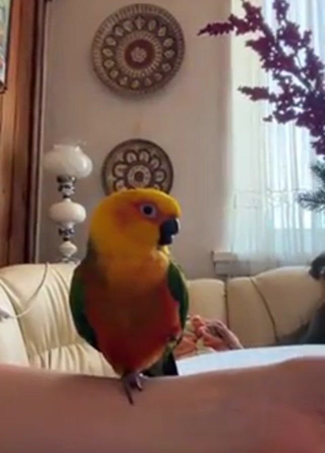 A sun conure parrot sits on a person's arm