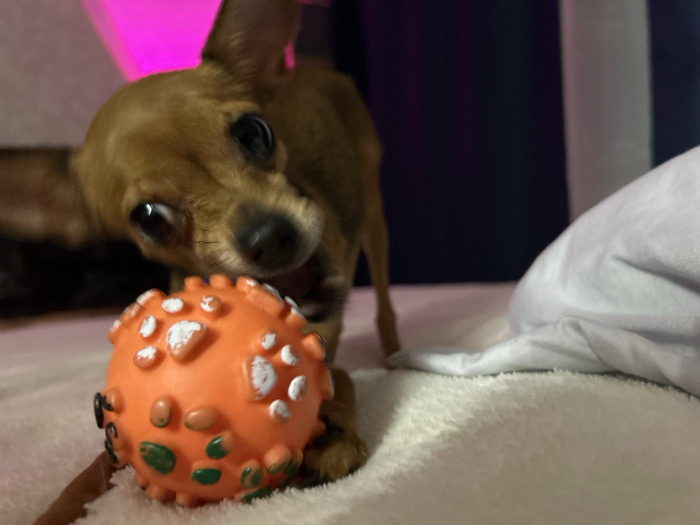 - "A small, tan Chihuahua is playfully lunging at an orange rubber ball dotted with white, green, and tan embellishments" by FM-5FD7E2, licensed under CC BY 4.0