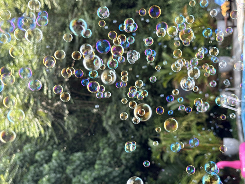 The image depicts an outdoor scene in Unawatuna, Sri Lanka. Hundreds of iridescent soap bubbles of varying sizes, displaying prismatic colors, are suspended across the frame. The background, rendered in soft focus, consists of dense green foliage, including large trees and tropical shrubs. In the lower portion of the image, a bright blue swimming pool is partially visible, containing a pink inflatable flamingo positioned in the lower-left. A water feature, possibly a small fountain, is present within or beside the pool on the right. Additional potted plants with green leaves are situated around the pool's edge. The scene is illuminated by natural daylight. No individuals are present.