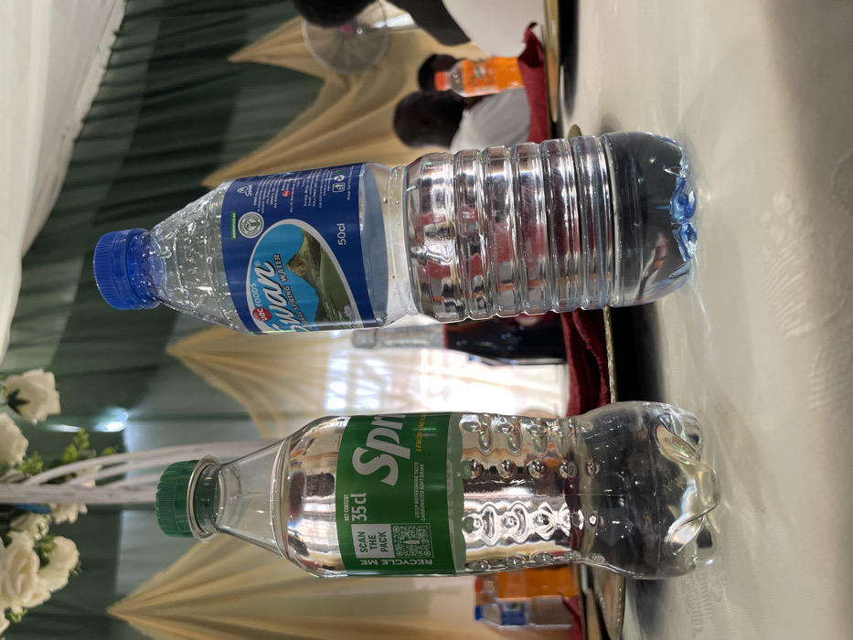 This image captures an indoor event in Jos, Nigeria, from a low perspective across a white-clothed table. Two plastic beverage bottles are centered in the foreground: a 35cl Sprite with a green cap and clear liquid on the left, and a 50cl Swan Natural Spring Water with a blue cap and clear liquid on the right. Both bottles display condensation. Behind them, a gold-rimmed plate and a red napkin are partially visible on the table. Further back, another bottle containing a dark red liquid and an orange beverage bottle are present. Multiple individuals are seated in the blurred background, with one person in a white shirt identifiable. The environment is decorated with draped light cream/gold and dark green fabric, and white floral arrangements with ribbons suspended overhead. A wall-mounted fan is visible on the far right.
