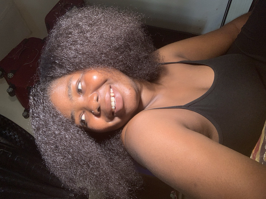 A young woman with dark skin and voluminous black hair smiles warmly at the camera. She's wearing a black tank top. Her head is tilted to the left, showcasing a nose piercing and radiant skin. A suitcase is visible in the background on the left, and part of a patterned surface on the bottom right. The lighting is bright, emphasizing her cheerful expression and hair texture.