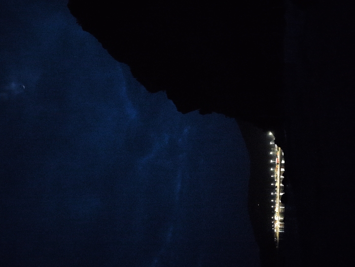 The image presents a nighttime scene in Prijevor, Montenegro. A dark, irregular rock formation or cliff face occupies the right foreground, silhouetted against a deep blue-black sky. A faint crescent moon is visible in the upper central sky, which displays subtle cloud patterns. In the midground, a body of water reflects a linear arrangement of approximately 15-20 bright, yellow-white artificial lights. These lights illuminate a distant coastal strip, pier, or roadway. Dark, featureless hills or mountains form the background beyond the lighted structures. No individuals, specific actions, or interactions are discernible.