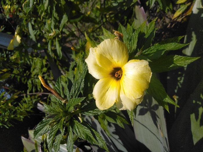 A single, open yellow flower, consistent with *Turnera ulmifolia*, dominates the central-right portion of the frame