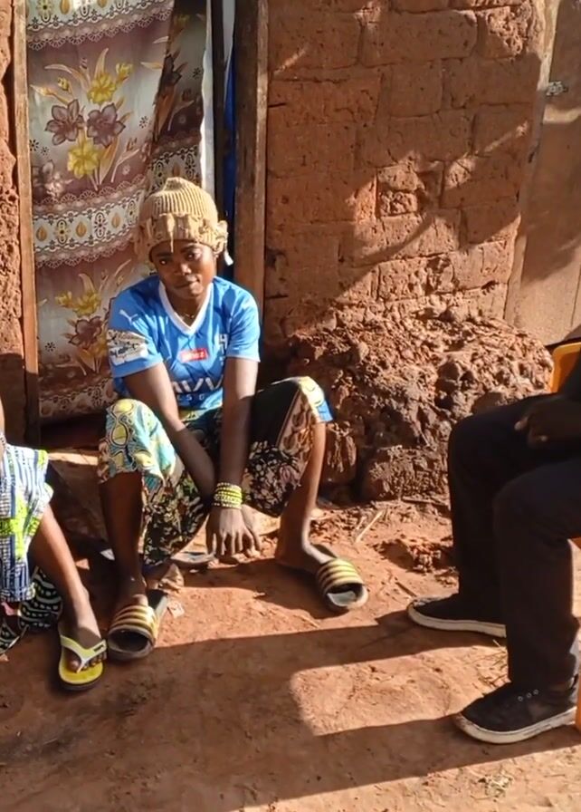 A medium shot shows a woman sitting in the dirt in front of a mud brick house, holding a baby in her lap. To her right, a young woman sits cross-legged. Across from them, a man sits on a yellow plastic chair. All are facing the camera, and the man looks into the camera in the end. The woman holding the baby wears a black-and-white patterned top and a colorful patterned skirt. The baby is dressed in white. The young woman wears a blue soccer jersey, patterned pants, and a knit hat. The man wears a beige vest and black pants. Behind them, the house has a patterned curtain hanging in the doorway. There is a pile of mud bricks next to the doorway. The ground is dirt.