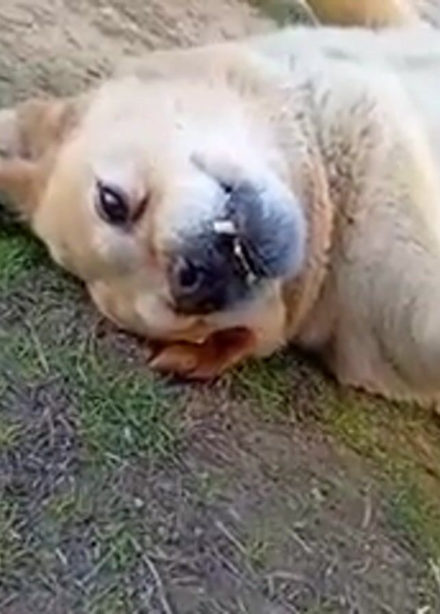 A medium-sized, light-colored dog with short fur lies on its back on a patch of grass and dirt. It is looking directly into the camera with its head tilted slightly. A person's hand with bracelets and tattoos enters the frame and gently strokes the dog's nose and face. The background is slightly blurred, suggesting a natural outdoor setting.