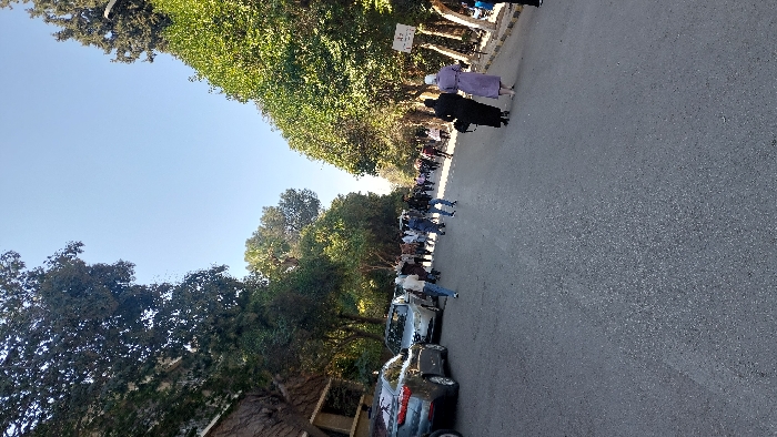 The image displays an outdoor, daytime scene on a paved road within Ash-Shaghour Municipality, Syria, under a clear, light blue sky. A dark grey asphalt road, speckled with aggregate, extends into the background, curving slightly to the right. Dense green foliage from trees lines both sides of the thoroughfare. On the left, a light-colored building partially covered in dark green ivy is visible behind two parked sedans: a dark grey car (possibly a Nissan Altima or similar model) is in the foreground, and a silver car is positioned just ahead of it, both facing away from the viewer. A crowd of approximately 20-30 individuals is visible on the road, primarily on the right-hand side and in the middle distance, generally walking away from the camera. In the immediate right foreground, three individuals are walking: one wearing a long black garment and a black head covering, another in a light purple long dress and a white head covering, and a third in dark clothing partially out of frame. Other individuals in the midground and background wear various casual attire, with some also wearing head coverings. On the far right, a low stone wall or barrier runs alongside the road, topped by a metal fence to which a white rectangular sign with black, illegible text is attached. The entire scene is brightly illuminated by direct sunlight.